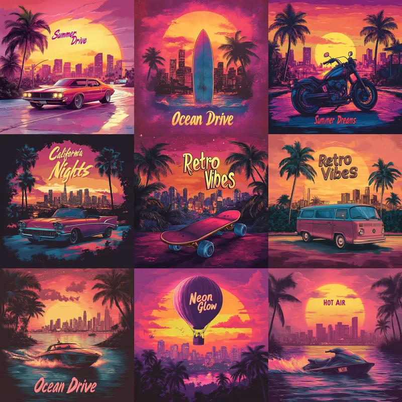 Styles include retro postcards, vintage illustrations, sepia tones, and mid-century textures